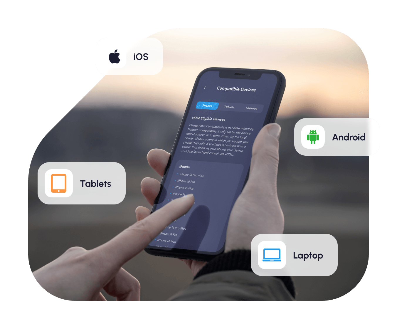eSIM stands for embedded SIM and allows you to get connected anywhere, anytime. It works like a traditional SIM card, except without a need for the physical card. As long as your device is compatible, you will be able to use an eSIM.